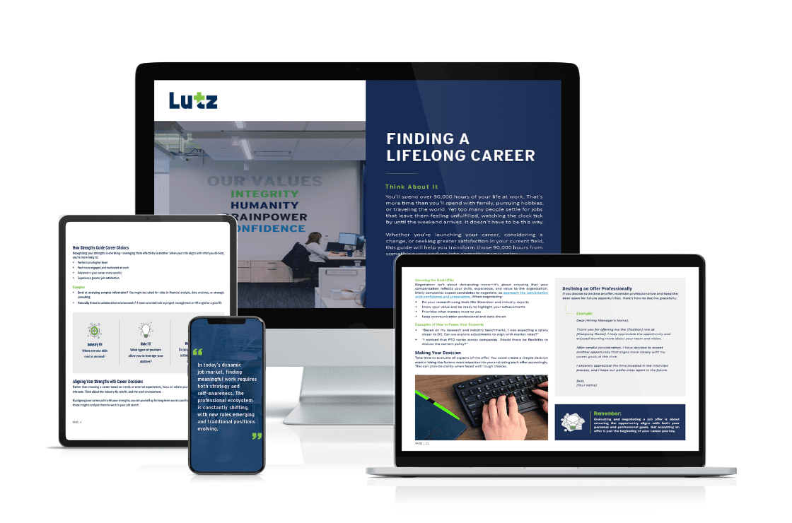 We continually develop a broad interpersonal network, ensuring that when the perfect opportunity presents itself, you’ll be invited to the conversation. Lutz and our clients realize that hiring extraordinary talent pays for itself over and over again. We’ll work with you to identify what your work is worth and ensure that you are offered a fair and competitive salary.
